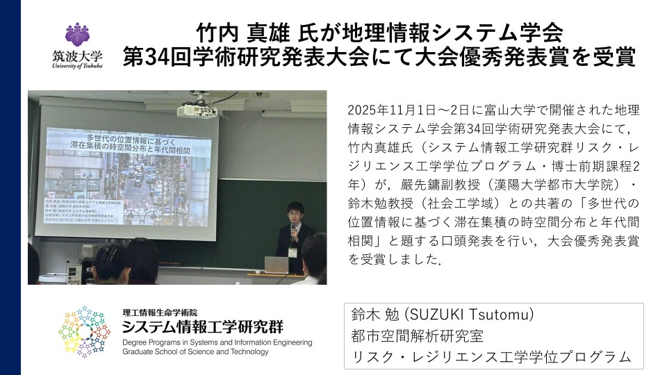 2024年10月26日~27日に開催された地理情報システム学会第33回学術研究発表大会にて,竹内真雄氏(システム情報工学研究群リスク・レジリエンス工学学位プログラム・博士前期課程1年)が,嚴先鏞副教授(漢陽大学都市大学院)・鈴木勉教授(社会工学域)との共著の「東京区部における交通量密度‧移動速度に基づく交通軸と移動効率性評価」と題するポスター発表を行い,ポスターセッション賞を受賞しました.