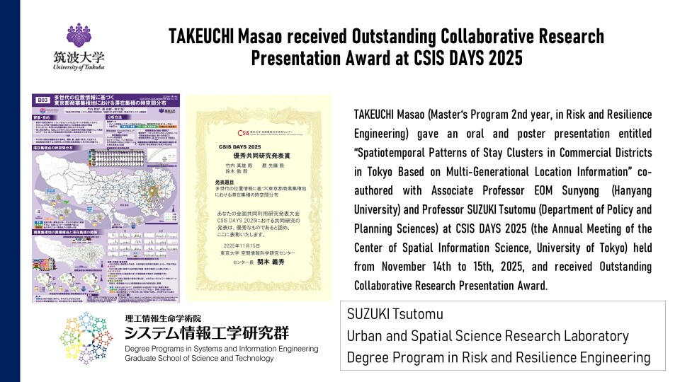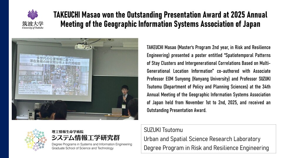 TAKEUCHI Masao (Master‘s Program 2nd year, in Risk and Resilience Engineering) presented a poster entitled “Extracting Traffic Corridors and Analyzing Relationship between Inter-District Travel Efficiency and Traffic Corridors Using People Flow Data” co-authored with Associate Professor EOM Sunyong (Hanyang University) and Professor SUZUKI Tsutomu (Department of Policy and Planning Sciences) at Japan Geoscience Union Meeting 2025 held from May 25th to 30th , 2025, and received the Outstanding Student Presentation Award.