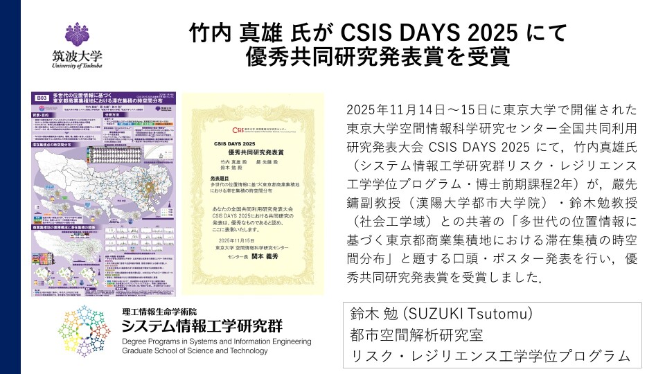2025年5月25日~30日に開催された日本地球惑星科学連合2025年大会にて,竹内真雄氏(システム情報工学研究群リスク・レジリエンス工学学位プログラム・博士前期課程2年)が,嚴先鏞副教授(漢陽大学都市大学院)・鈴木勉教授(社会工学域)との共著の「人流データを用いた交通軸の抽出と地域間移動効率性との関連分析」と題する口頭発表を行い,学生優秀発表賞を受賞しました.
